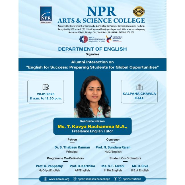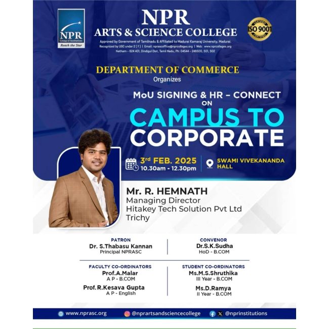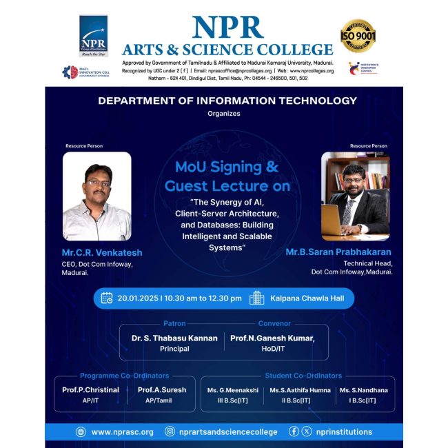 The Department of Information Technology organizes a MoU Signing Ceremony and Guest Lecture on The Synergy of Al, Client-Server Architecture, and Databases: Building Intelligent and Scalable Systems for their students Resource Persons: Mr. C. R. Venkatesh, CEO, Dot Com Infoway, Madurai. ******************************** Mr. B. Saran Prabakaran, Technical Head, Dot Com Infoway, Madurai.