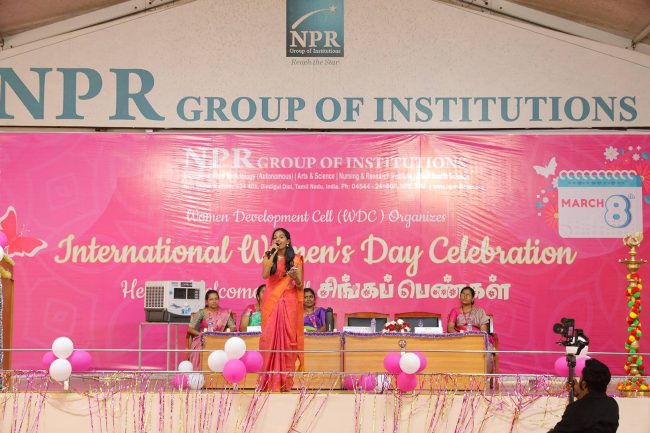The NPR Group of Institutions organized an International Women’s Day Celebration for their female students and staffs Chief Guest: Ms. Gomathi Ram, Motivational Speaker, Singer & Vocalist.