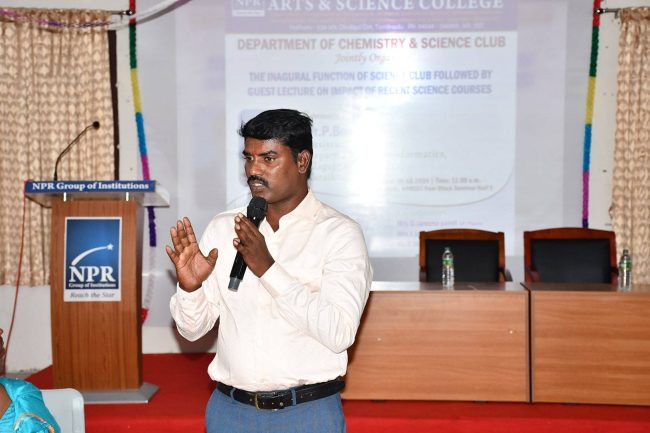 The Department of Chemistry organized the Inaugural Function of the Science Club & Guest Lecture on the Impact of Recent Science Courses Chief Guest: Dr. P. Boomi, Assistant Professor, Department of Bioinformatics, Alagappa University, Karikudi.