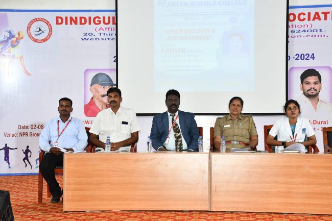 The National Service Scheme (NSS) & Mens Development Cell (MDC) organized an Awareness Programme on Cyber Security & Anti Drugging for their students. Chief Guest: Mr. P. Deivam, MA., M.Phil., Addl.supdt. of Police, Cyber Crime, Dindigul